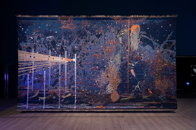 - Above the TV screens there are banners hanging with paintings of fish on them