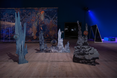 - To the left there are two tv screens playing scenes from underwater and the deep sea