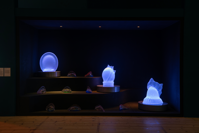 - When you leave the dark room on your right there are large pieces of wood that have videos of underwater creatures playing on them