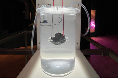 - There is a large jar filled with water and what looks like a piece of coral can be seen
