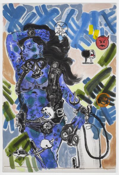 Works like Hunter Watching the Beach (2016) and La Vergne in the Afternoon (2017) embody her playful reappropriation of the exoticised and eroticised female nude, reinterpreting this traditional art trope through a contemporary lens by integrating middle-aged bodies in vivid, sun-bleached hues. Later works, such as Temple Creation (2020) and Scuba Sauvage Azure Bleu (2021), introduce bold new visual approaches, blending ink washes, experimental canvases, fluid lines, and emoji symbolism. These pieces articulate the struggles and triumphs of the female body gaining agency amidst the distorting pressures of mediated beauty standards.