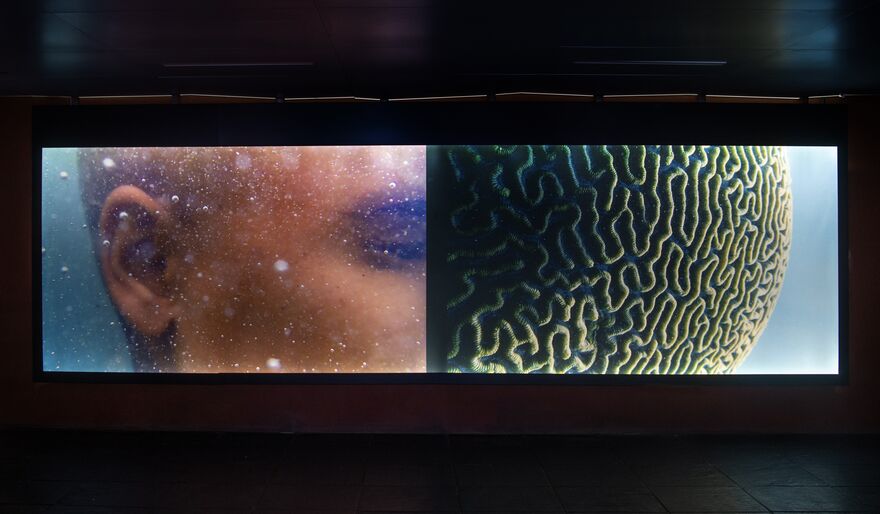 Huggins’ Transformation series (2014–2016) considers her relationship with marine ecosystems, and documents the underwater life that surrounds her. Displayed in Baltic’s Lightbox, Transformation 4 combines a self-portrait with an image of brain coral, an organism which can grow up to six feet tall and live for up to 900 years. The images are positioned side-by-side; the space between them evokes the act of resurfacing from the underwater environment, and the separation between human and marine worlds.
