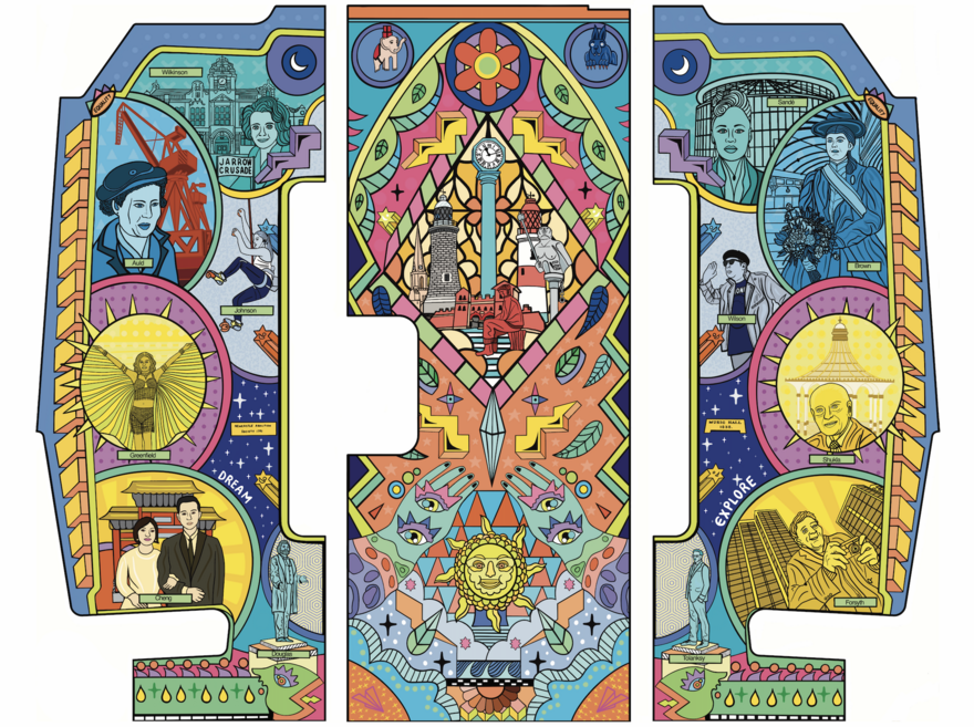Sofia Barton's Shop2 takeover celebrates the "hidden" heritage and community leaders of our region, showcasing the vibrant work from her celebrated ‘Trailblazers’ mural, commissioned for the new fleet of Tyne and Wear Metro trains.